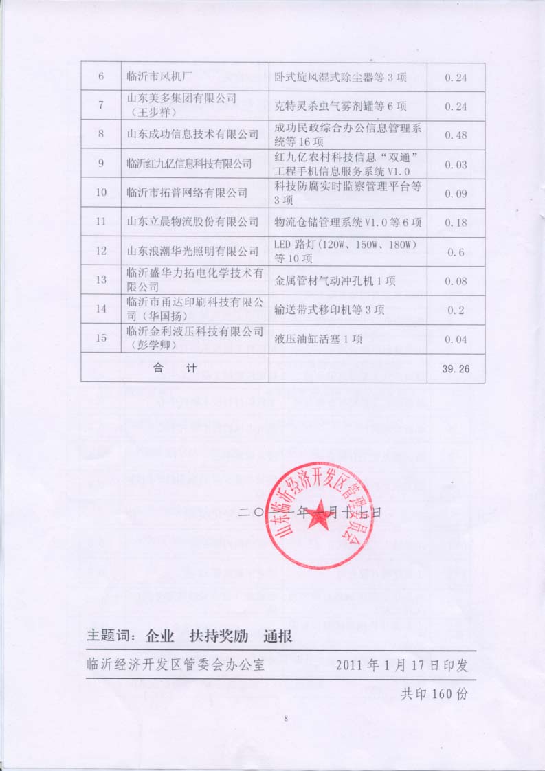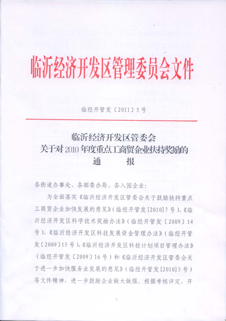 | 熱烈祝賀我公司在臨沂經(jīng)濟(jì)技術(shù)開發(fā)區(qū)2010年度總結(jié)表彰大會(huì)上獲多項(xiàng)獎(jiǎng)項(xiàng) |