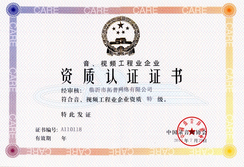 2011年7月29日,經(jīng)中國(guó)錄音師協(xié)會(huì)對(duì)我公司上報(bào)的材料審核,評(píng)定我公司為音、視頻工程業(yè)企業(yè)特級(jí)資質(zhì),并予以頒發(fā)工程業(yè)企業(yè)特級(jí)資質(zhì)認(rèn)證證書。 音、視頻工程業(yè)企業(yè)特級(jí)資質(zhì)的獲得,使公司在魯南地區(qū)同行業(yè)施工資質(zhì)水平站在最前列。這將大大提高我公司的市場(chǎng)綜合競(jìng)爭(zhēng)能力和企業(yè)信用等級(jí),公司可以為合作單位提供更為優(yōu)質(zhì)的服務(wù),為今后數(shù)年的大發(fā)展打下了堅(jiān)實(shí)的基礎(chǔ)。 特級(jí)資質(zhì)的獲得,是公司發(fā)展的又一新的里程碑,消息傳來,公司各崗位員工倍感振奮與自豪,紛紛表示要以更大的工作熱情、更高的工作效率、更強(qiáng)的敬業(yè)精神開展工作,充分利用好這一發(fā)展平臺(tái),再接再厲、奮發(fā)有為,在今后數(shù)年時(shí)間里推動(dòng)企業(yè)取得跨越式發(fā)展、為社會(huì)打造更多的精品工程!