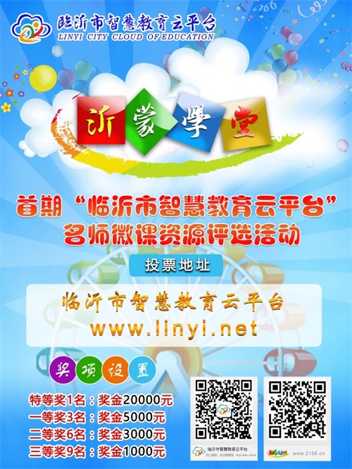 活動(dòng)時(shí)間安排 初 選:5月8日—10日 網(wǎng)絡(luò)投票:5月11日—20日 專家評(píng)審:5月21日—25日 公 示:5月26日—28日 獎(jiǎng)項(xiàng)設(shè)置 特等獎(jiǎng)1名:獎(jiǎng)金20000元 一等獎(jiǎng)3名:獎(jiǎng)金各5000元 二等獎(jiǎng)6名:獎(jiǎng)金各3000元 三等獎(jiǎng)9名:獎(jiǎng)金各1000元 本次活動(dòng)將抽出100名參與投票的幸運(yùn)觀眾,贈(zèng)送價(jià)值100元的精美禮品一份。 網(wǎng)絡(luò)投票方式 1、投票地址 網(wǎng) 址:臨沂市智慧教育云平臺(tái) 微信號(hào):臨沂市智慧教育云平臺(tái) linyi-edu-cloud 2、投票規(guī)則