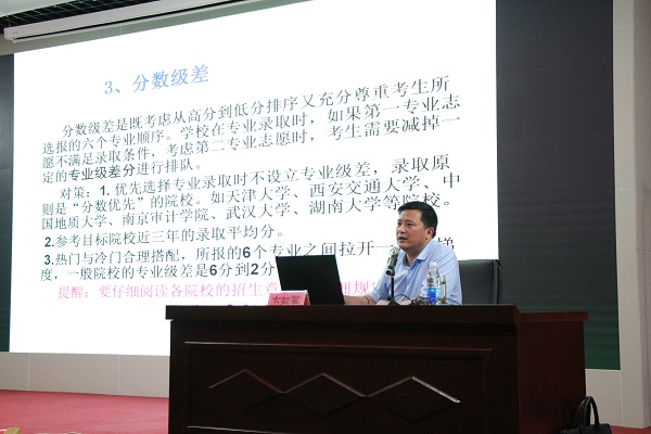 來自全市各高中的百余名高三班主任老師參與了第一天的講座,卞如軍老師為到場老師們解讀了2018年山東省高考志愿填報政策新變化及常見誤區(qū)。卞如軍由發(fā)生在身邊的幾起填報事例說起,生動形象的為老師們闡述了正確合理填報高考志愿的重要性。隨后,卞老師還將他精心總結(jié)的填報口訣教授給了到場老師,并與老師們就新高考改革和志愿填報等方面的常見問題展開了深入的交流分析。在第二天的講座上,卞如軍老師與到場的家長和高三考生們分享了高考志愿填報的基本流程和常見風(fēng)險,并就如何準(zhǔn)確定位選擇專業(yè)和大學(xué)等方面的問題對大家提出了針對性建議。