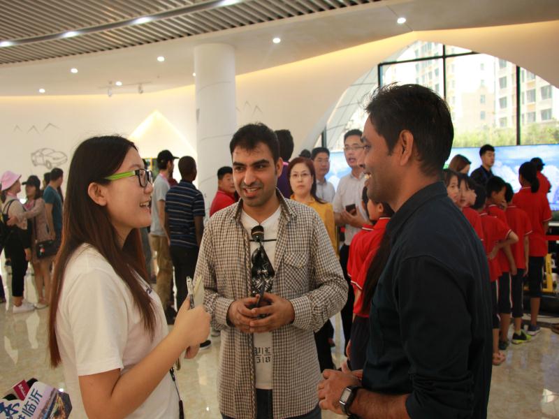 隨后,在中印專家隊(duì)伍的帶領(lǐng)下,留學(xué)生們來到了創(chuàng)客中心。無巧不成書,一支來自臨沂市的小學(xué)生隊(duì)伍正在創(chuàng)客中心內(nèi)進(jìn)行綜合實(shí)踐,兩支隊(duì)伍隨即展開了熱切的交流,并共同體驗(yàn)創(chuàng)客中心內(nèi)的各個(gè)項(xiàng)目。整個(gè)上午,蓮花狀的山東智慧教育創(chuàng)客中心內(nèi),充滿了來自五湖四海不同膚色的小朋友和大朋友們的歡聲笑語(yǔ)。