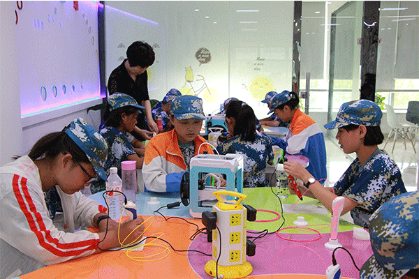 為什么設(shè)計(jì)的是平面圖形3D打印機(jī)卻可以使之立體化?為什么一塊塊不起眼的零件最終能拼插成一個(gè)能夠自主行動(dòng)的機(jī)器人?為什么看似簡(jiǎn)單易學(xué)的空竹抖起來(lái)會(huì)這么精彩?為什么簡(jiǎn)單的電路知識(shí)也可以操縱這么復(fù)雜的構(gòu)造?在山東智慧教育創(chuàng)客活動(dòng)中心綜合實(shí)踐區(qū),同學(xué)們帶著這些疑問(wèn),選修了園區(qū)今年夏天最新引進(jìn)的28間創(chuàng)客教室上百項(xiàng)研學(xué)課程中的幾項(xiàng)精品課程。對(duì)于這些初中新生而言,基地各項(xiàng)精彩紛呈的創(chuàng)客課程為他們打開(kāi)了新世界的大門,激發(fā)了他們對(duì)即將面臨的中學(xué)生活的好奇心與信心,使他們能夠帶著疑問(wèn),在課程學(xué)習(xí)中去探索發(fā)現(xiàn),最終在創(chuàng)客課程中找到了答案,更提高了自身的探究能力。