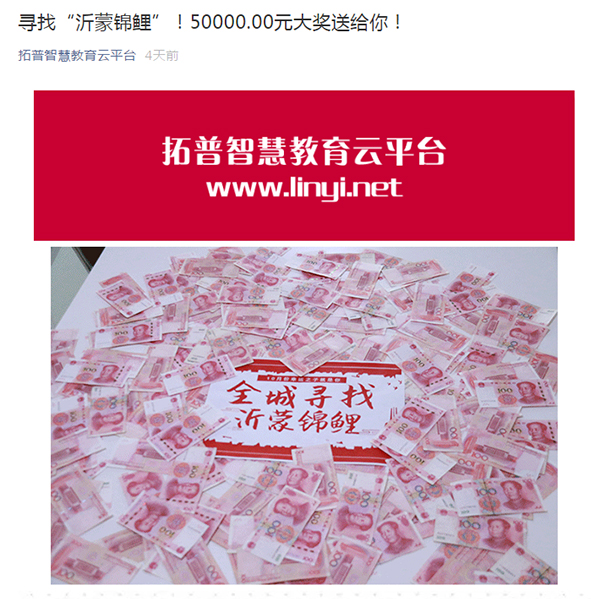 據(jù)了解,本次“尋找沂蒙錦鯉”抽獎活動10月10日發(fā)起于拓普公司公眾號“拓普智慧教育云平臺”,是一個面向廣大粉絲的福利活動,只要在活動期間關注公眾號“拓普智慧教育云平臺”轉(zhuǎn)發(fā)活動文章,并下載注冊“和博士”APP即可報名參與抽獎。