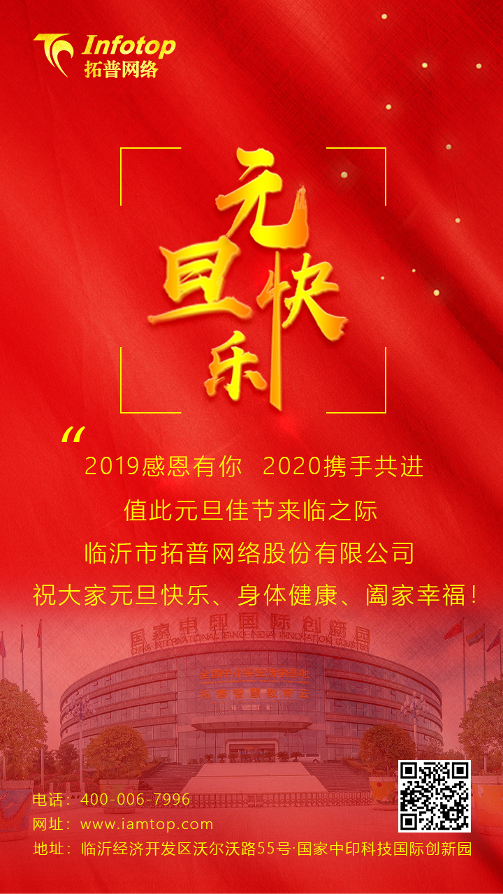 值此元旦佳節(jié)來臨之際,臨沂市拓普網(wǎng)絡(luò)股份有限公司全體員工向長期以來所有關(guān)心、支持公司的各位領(lǐng)導(dǎo)、各界朋友致以衷心的感謝和誠摯的問候,祝大家元旦快樂、身體健康、闔家幸福!