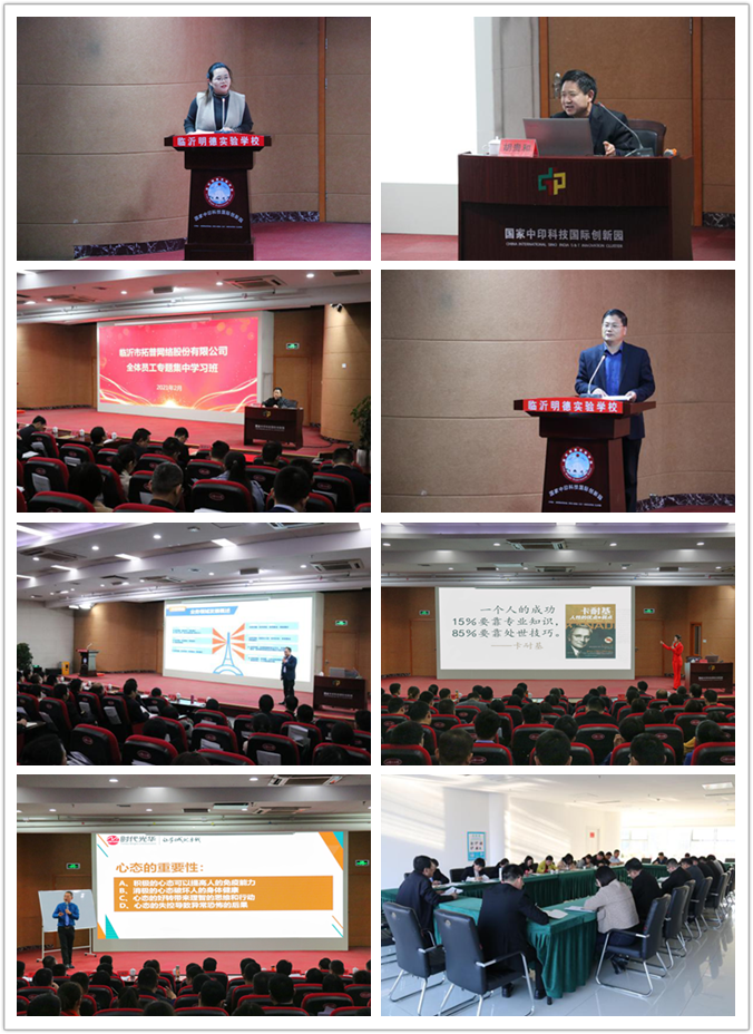為加深全體員工對(duì)企業(yè)發(fā)展、企業(yè)文化及規(guī)章制度的認(rèn)識(shí)理解,實(shí)現(xiàn)公司規(guī)范管理、跨越式發(fā)展總目標(biāo)。2月17日至19日,臨沂市拓普網(wǎng)絡(luò)股份有限公司組織開(kāi)展“全體員工專題集中學(xué)習(xí)班”。公司董事長(zhǎng)王嵐保、總經(jīng)理王德程,學(xué)校校長(zhǎng)劉勝群等領(lǐng)導(dǎo)出席會(huì)議。公司全體員工、學(xué)校教師代表共計(jì)260余人參加本次學(xué)習(xí)班。