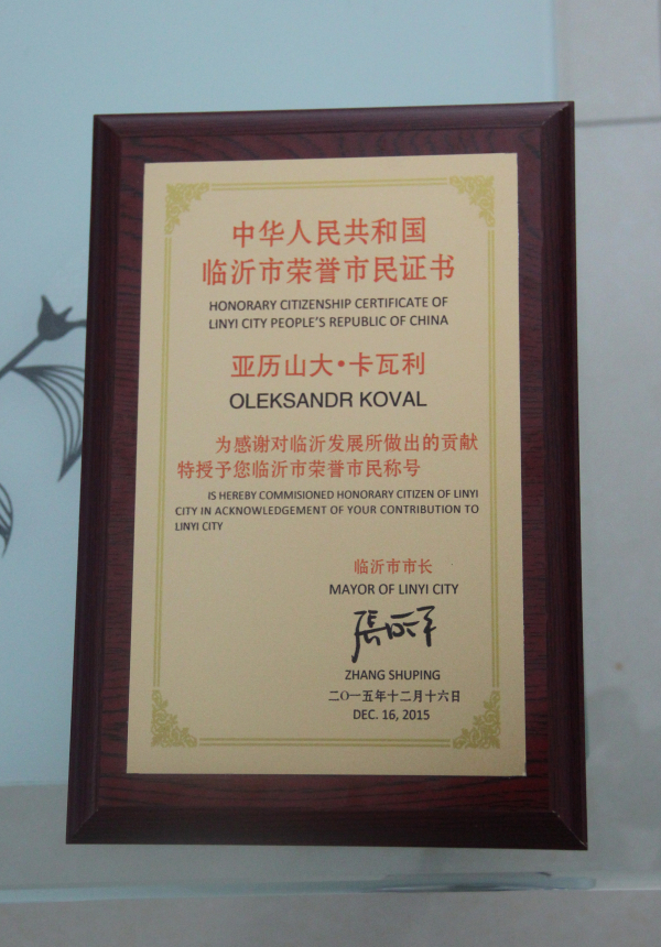| 祝賀公司烏克蘭亞歷山大·卡瓦利博士榮獲“臨沂市榮譽(yù)市民”稱號 |